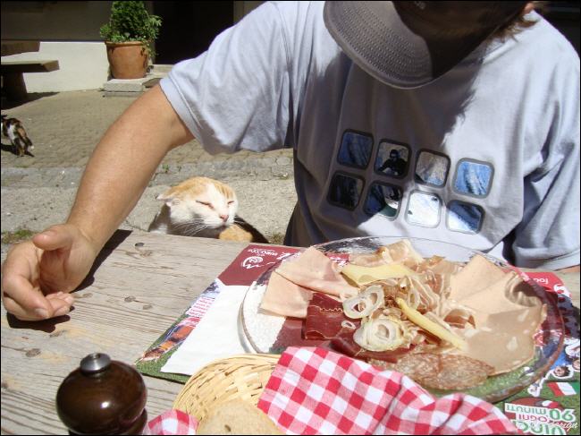 Fereienzeit ! Auch bei uns in Roggwil machte die Urlaubswelle nicht halt. Nach dem gelungenen Umbau des Badezimmers,war auch bei uns Erholung angesagt. Zudam jährte sich das Geburtstagsfest der Shwiegermutter,das wie üblich auf der schwäbischen Alb gefeiert wird. Neben den Festvorbereitungen,blieben ein paar Tage zum Verweilen,Shoppen, Minigolfen und für den Besuch in der Bärenhöhle. Zwischen Grossputz ( Umbaunachwehen ! ! ) und Gartenarbeit stürtzte sich Christa wieder mutig ins Spitalgetümmel in Burgdorf. So nebenbei gönnten wir uns einen kleinen Wanderausflug auf Albhöhe(1000 m. ü. M.)Hinteregg- Vordere Schmiedenmatt und zurück inkl. Mittagessen mit Kuhglockengebimmel und Bettelviechern.Was wäre Franz ohne seine Vögel ? Wenn keine Vögel vorhanden sind, begnügt er sich auch mal mit Vogeljägern. Also den Fleischteller vom nächsten Bild,hat Franz erfolgreich verteidigt und ganz alleine aufgegessen. Nicht alles was Katz ist , ist Bänz ! Mit Bänz hätte ich vielleicht geteilt! |