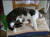 Entwarnung! Es geht ihm wieder besser unserem Bio-Rheumafell. Heute Morgen sass er vorwitzig wie immer über dem Eingang und kontrollierte das Geschehen.Sogar ein guten Morgen "Miauu" war von ihm zu hören.Heute machte er keine Liegepause über dem Eingang.Als die Türe auf ging,reckte und streckte er sich da oben und nahm den Weg nach unten unter die Pfoten.Vorsichtig und das hintere rechte Bein schonend kletterte er nach unten.Hier angelangt streckte er sich noch einmal ausgiebig um dann zwischen meinen Beinen hindurch, zum Futternapf zu stapfen,wie wenn es nie ander gewesen wäre.Er bewegte sich flink und ohne hinken über den Fliesenboden. Das zweite Gelenk am Hinterlauf scheint ihm Beschwerden zu machen. Hungrig machte er sich über die Futterreste vom Vortag her! Danach machte er sich aber gleich wieder auf, um durch die Eingangstüre zu entschwinden. Er ist nicht mehr so ängstlich und distanziert wie am Dienstag und Mittwoch,aber noch lange nicht fit wie vorher. Nach der Fütterung drehte er noch eine Ehrenrunde ums Haus um danach im Quartier unterzutauchen.Zwischen 16.00 und 17.00 h wird er sicher wieder zur Fütterung auftauchen(Kaffeezeit).Und er kam tatsächlich! |