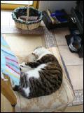 Samstag : Bänz steht vor der Türe zum Esszimmer! Laut Miauend kommt er in die Küche und sucht sein Futter. Christa holt den Napf vor der Türe, reinigt ihn und reicht dem armen Tiger sein Frühstück. Er frisst nicht mehr als an anderen Tagen auch. Danach legt er sich auf seinen Thron. Da wir weg müssen, schmeissen wir ihn wieder an die frische Luft, im Wissen, dass er uns das vielleicht nicht verzeiht und wieder wegbleibt. Am Nachmittag um ca. 15.30 h sind wir zurück. Als wir auf unseren Parkplatz fahren, schleicht Bänz unter dem Auto des Nachbarn hervor und macht sich auf den Weg uns zu begrüssen. In der Zwischenzeit sind wir nun auch ausgestiegen und rufen nach der Katze. Laut Miauend rennt sie uns entgegen.Sie begleitet Christa , die schneller als ich unterwegs ist bis zum Hauseingang. Dort wartet sie vor der offenen Türe, bis sie sicher ist, dass ich auch kommme. Erst jetz rennt sie zum Futternapf. Wir sind froh, dasss Bänz wieder da ist. Unser Leben spielt mit Bänz ! Wir haben uns so an die Katze gewöhnt, dass uns ihre Abwesenheit stört. |