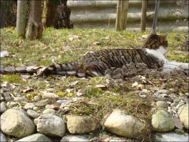 Freitag : Bürokram erledigen, Einladungen versenden Mittagessen und ab in die Physio. Ein schöner Frühlingstag meldet sich an. Die Temperatur an der Fensterleibung direkt an der Sonne beträgt um 16.00 Uhr noch so an die 45° C. Bänz verteilt sein Fell nun bereits an den schattigen Plätzen des Naturgartens. In der noch farblosen Umgebung, braucht es schon einen geübten Blick, um unseren Tiger zu finden! |