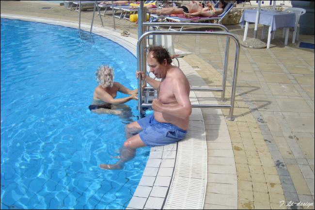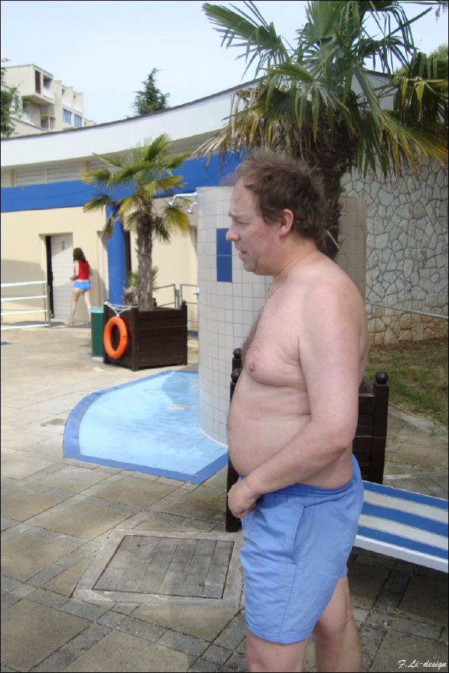 Was macht Franz um ins erfrischende Nass zu kommen? ? Frauenmässig kreischend Schritt für Schritt in den Pool schreiten und den Körper Centimeterweise in die Fluten tauchen ? ? Mitnichten ! ! |