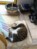 - Entwarnung! Es geht ihm wieder besser unserem Bio-Rheumafell. Heute Morgen sass er vorwitzig wie immer über dem Eingang und kontrollierte das Geschehen.Sogar ein guten Morgen "Miauu" war von ihm zu hören.Heute machte er keine Liegepause über dem Eingang.Als die Türe auf ging,reckte und streckte er sich da oben und nahm den Weg nach unten unter die Pfoten.Vorsichtig und das hintere rechte Bein schonend kletterte er nach unten.Hier angelangt streckte er sich noch einmal ausgiebig um dann zwischen meinen Beinen hindurch, zum Futternapf zu stapfen,wie wenn es nie ander gewesen wäre.Er bewegte sich flink und ohne hinken über den Fliesenboden. Das zweite Gelenk am Hinterlauf scheint ihm Beschwerden zu machen. Hungrig machte er sich über die Futterreste vom Vortag her! Danach machte er sich aber gleich wieder auf, um durch die Eingangstüre zu entschwinden. Er ist nicht mehr so ängstlich und distanziert wie am Dienstag und Mittwoch,aber noch lange nicht fit wie vorher. Nach der Fütterung drehte er noch eine Ehrenrunde ums Haus um danach im Quartier unterzutauchen.Zwischen 16.00 und 17.00 h wird er sicher wieder zur Fütterung auftauchen(Kaffeezeit).Und er kam tatsächlich!