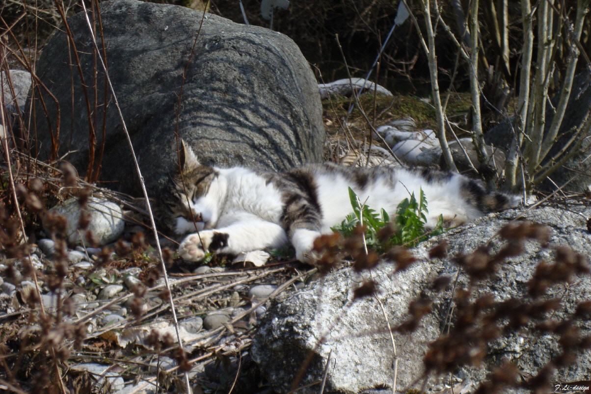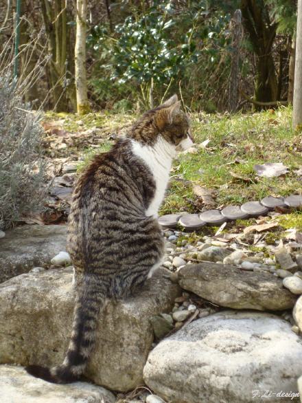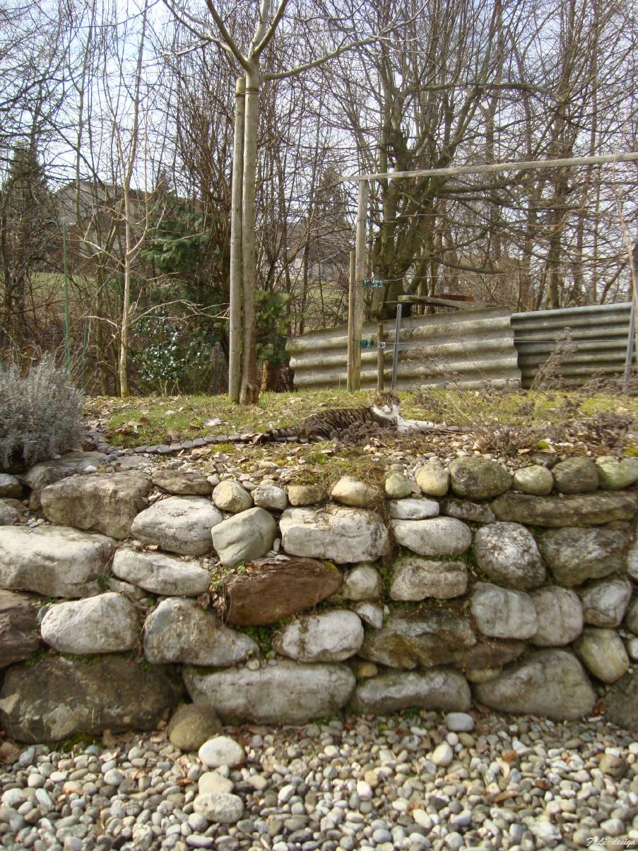 - Freitag : Bürokram erledigen, Einladungen versenden Mittagessen und ab in die Physio. Ein schöner Frühlingstag meldet sich an. Die Temperatur an der Fensterleibung direkt an der Sonne beträgt um 16.00 Uhr noch so an die 45° C. Bänz verteilt sein Fell nun bereits an den schattigen Plätzen des Naturgartens. In der noch farblosen Umgebung, braucht es schon einen geübten Blick, um unseren Tiger zu finden!