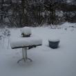 Aufgetischt : Es ist angerichtet. Der Gartentisch mit dem Futterhäuschen steht auf dem Sitzplatz.