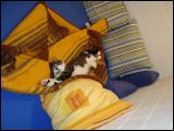 Katze : Bänz hat uns eine weitere Antwort auf eine wichtige Frage geliefert.Die Wühlmäuse, die durch ihr Hügelbauen den nahenden Winter- Kälteeinbruch vier Wochen im voraus angekündigt haben,verhielten sich bis jetzt sehr ruhig. Der Grund für ihre Ruhe, liegt wahrscheinlich bei Bänz dem Kater.- - Gefressene Mäuse bauen keine Hügel! Am Sonntagmorgen kam unser Haustiger angeschlichen mit einer "riesigen" Wühlmaus in der Fressluke. Die Maus hat er auf dem Sitzplatz deponiert, um sich danach das Apérohäppchen unter unserem Ofen zu genehmigen. Danach entsorgte er sein Mitbringsel, bis auf den ungeniessbaren Teil, den er uns zur Entsorgung überliess. Sollte Bänz gelungen sein, was Menschen über Jahrzehnte nicht geschafft haben? Die Gotthardwiesee Mausfrei ? Die Zukunft wird es zeigen."Wo ist Bänz"? Da wo der Korb ist natürlich! Unser Bi-üs-si, begnügt sich machmal damit, sich in irgendwelchen Körben mit Wäsche zu lagern. Die Umgebung spielt dabei keine Rolle. |