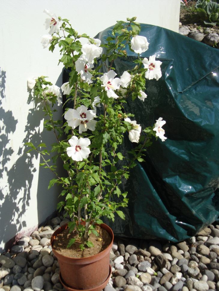 Der neue, weissblühende Hibiskus. Die Mausohren erheben ihre Blätter